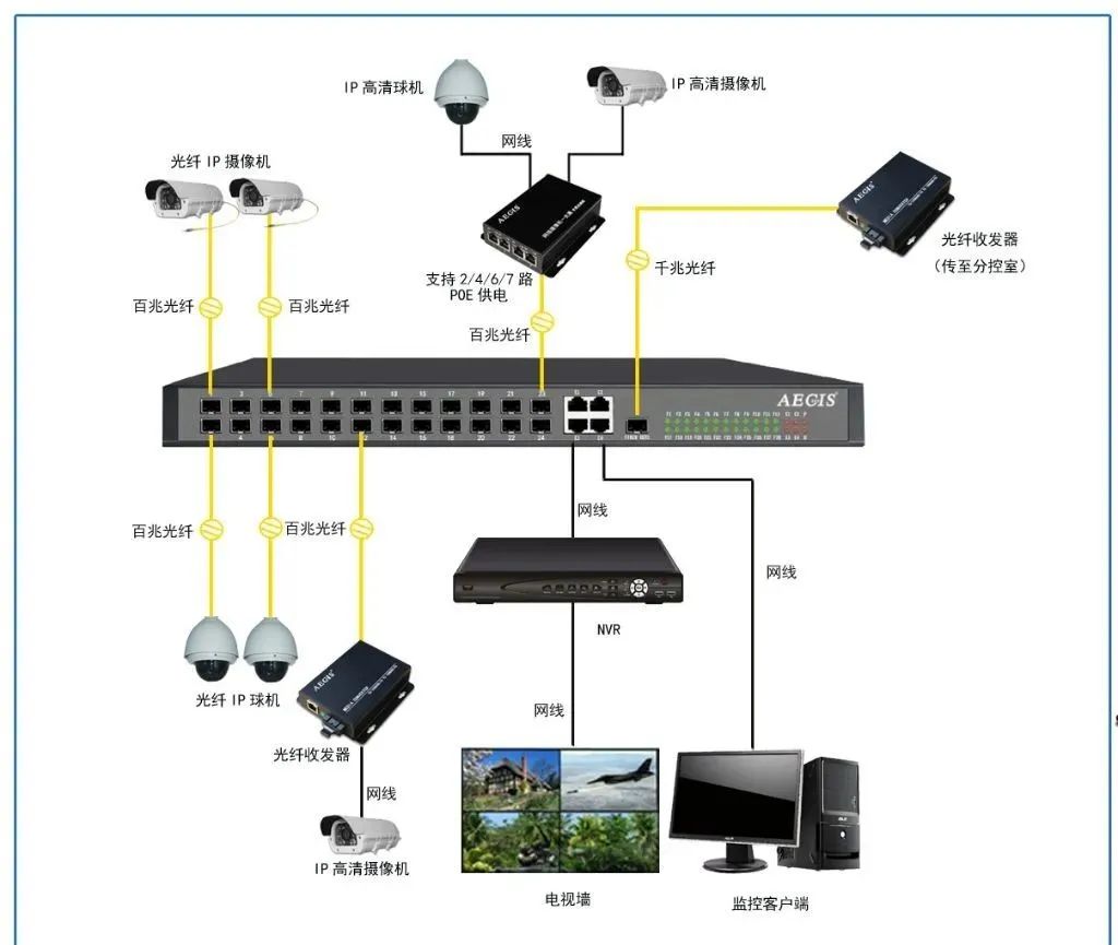 2、點(diǎn)對(duì)點(diǎn)傳輸如果多個(gè)攝像頭比較集中,可以把攝像頭連接交換機(jī)